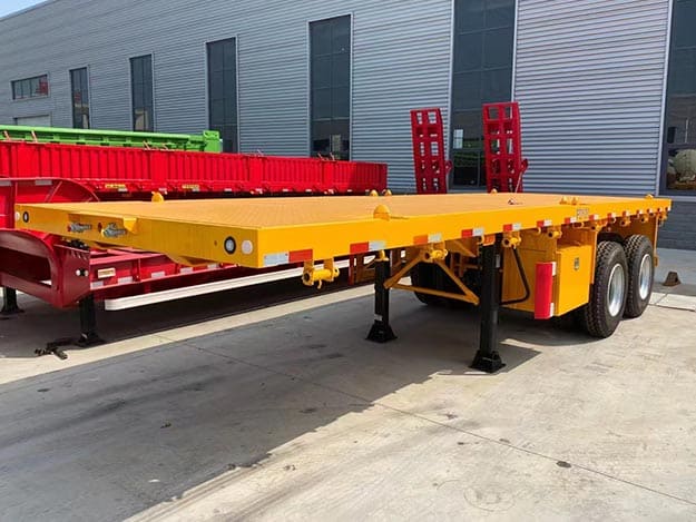 2 axles flatbed trailer is specifically designed for the transportation of various containers. The flatbed trailer with 8 or 12 pcs containers, its load capacity from 40 to 60 tons, the trailer is built for long-term use and possesses sufficient strength for repeated operations.