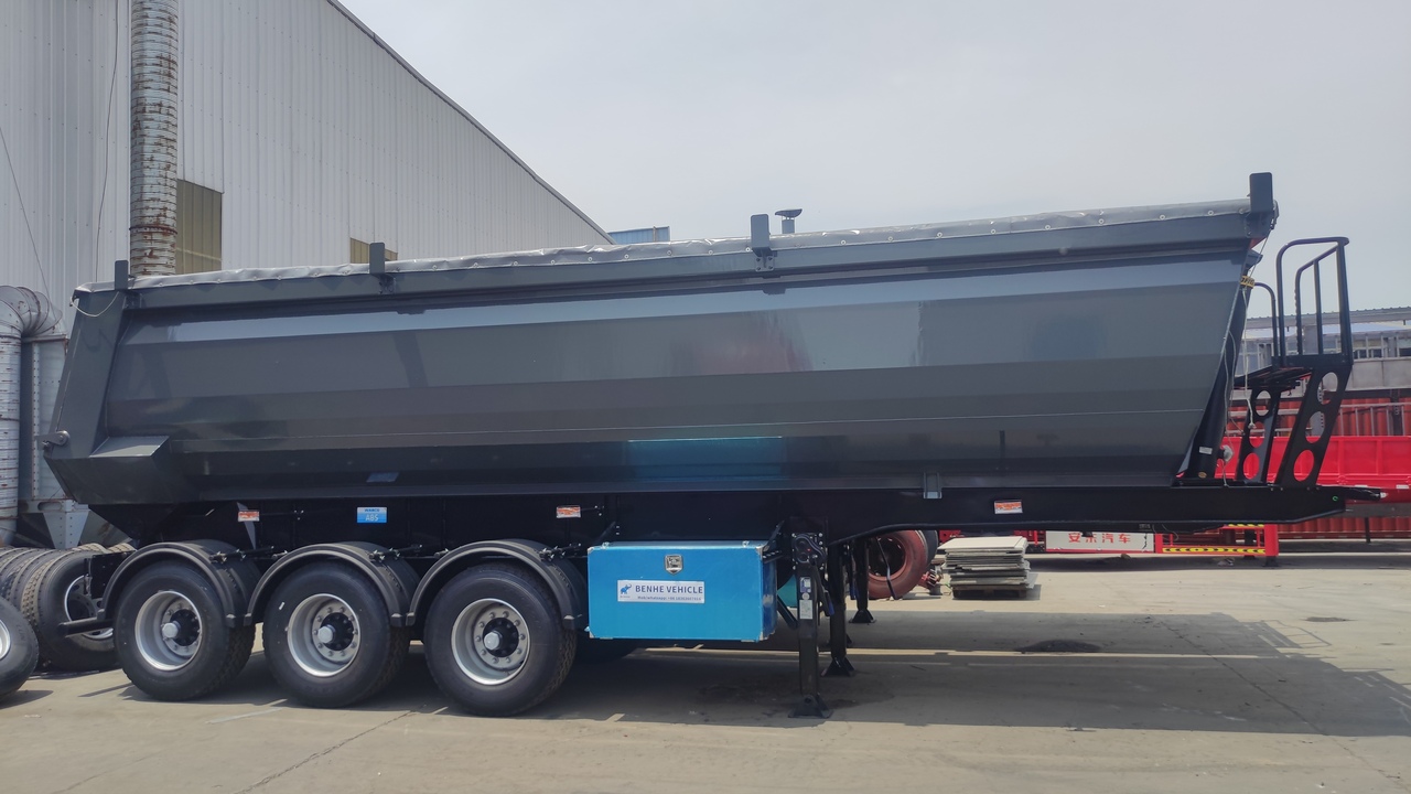 The 3 axles end dump trailer is mainly made up of a cargo box, chassis, and hydraulic system. The hydraulic system gets power from the truck’s PTO (Power Take-Off), using hydraulic cylinders to lift the cargo box. When the tilt reaches about 45°, the cargo slides out of the box, completing the unloading process.