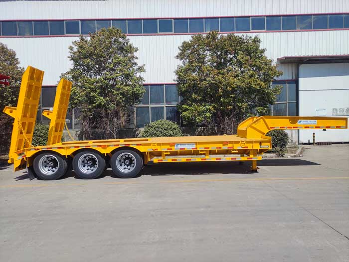 The low loader trailer has a lower working platform, easy for loading and unloading of goods. Additionally, the three-axle low bed trailer can be customized and adjusted according to customer requirements, such as adding an extension platform or installing guardrails.